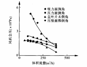 因?yàn)殇鰷u風(fēng)機(jī)流量大,側(cè)流道氣體的速度就大,湍流強(qiáng)度就大,造成沖擊損失較多,而壓力面倒角雖然從上面理論分析比未倒角能量頭低,但倒角相當(dāng)于進(jìn)口集流器.會(huì)減少流動(dòng)的沖擊損失,而流量越大這種損失就越多,